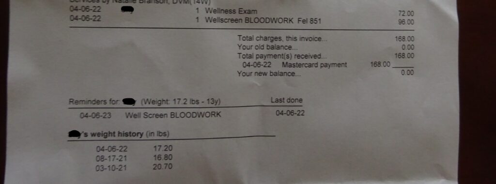 ドクターのチェックが72ドルで血液検査が96ドル。