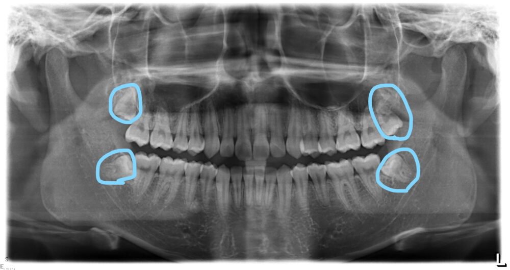 青丸のとこ4本が親知らずです・・・・横から生えている3本・・・どうみても放置していたら悪さする感じしますよね・・